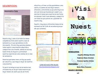Este documento describe un blog creado por estudiantes de 4to año de secundaria sobre lo que aprenden en su clase de matemáticas. El blog tiene como objetivo plasmar y compartir sus conocimientos matemáticos, mejorar su aprendizaje y usar la tecnología de forma educativa. Cubre temas de matemáticas de 4to año y fue creado por Josselyn Espinoza, Angelica Hidalgo y Ariana Guzmán bajo la supervisión de la profesora Betty Mena.