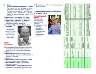 Este documento resume cinco teorías principales del desarrollo humano: la teoría psicosexual de Freud, la teoría psicosocial de Erikson, el conductismo en condicionamiento clásico y operante, el aprendizaje cognitivo de Piaget y Vygotsky, y la teoría bioecológica de Bronfenbrenner. Cada teoría describe principios fundamentales del desarrollo y etapas clave, con ejemplos de investigaciones asociadas.