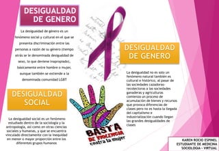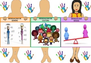 Este documento trata sobre la desigualdad de género y cómo es un fenómeno social y cultural que involucra discriminación entre personas basada en su género. También explica que la desigualdad social es un tema estudiado en sociología y antropología vinculado a la inequidad entre grupos humanos. Además, señala que la desigualdad no es solo natural sino también cultural e histórica, surgida con el paso de sociedades de cazadores-recolectores a sociedades ganaderas y agrícolas, y exacerbada