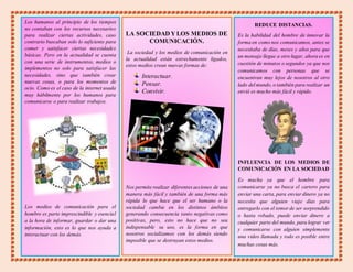 El documento describe la relación entre la sociedad y los medios de comunicación. Explica que la sociedad se refiere al conjunto de individuos que mantienen relaciones entre sí, mientras que los medios de comunicación son instrumentos usados para informar y comunicar mensajes de forma textual, sonora, visual o audiovisual. Señala que en la actualidad la sociedad y los medios de comunicación están estrechamente ligados, ya que los medios crean nuevas formas de interactuar, pensar y convivir, permitiendo realizar acciones de manera más fácil y rápida.