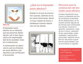 El documento habla sobre el bienestar socio-afectivo en los adolescentes. Algunos de los principales recursos que les permiten construir su bienestar son la autoestima, el cuidado de sí mismos, e igualdad de oportunidades. También menciona que el bienestar socio-afectivo es un derecho que las personas deben ejercer y que representa una responsabilidad de la sociedad y el Estado.