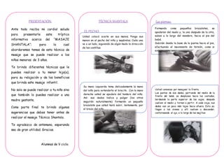 Este documento proporciona instrucciones para realizar un masaje Shantala a bebés menores de 3 años. Recomienda establecer confianza con el bebé antes del masaje, mantenerlo cálido y cómodo, y usar aceite natural. Explica que el masaje proporciona sensaciones placenteras a través del tacto, sonido, olor y visión que pueden contrarrestar los efectos del estrés prenatal y posnatal.