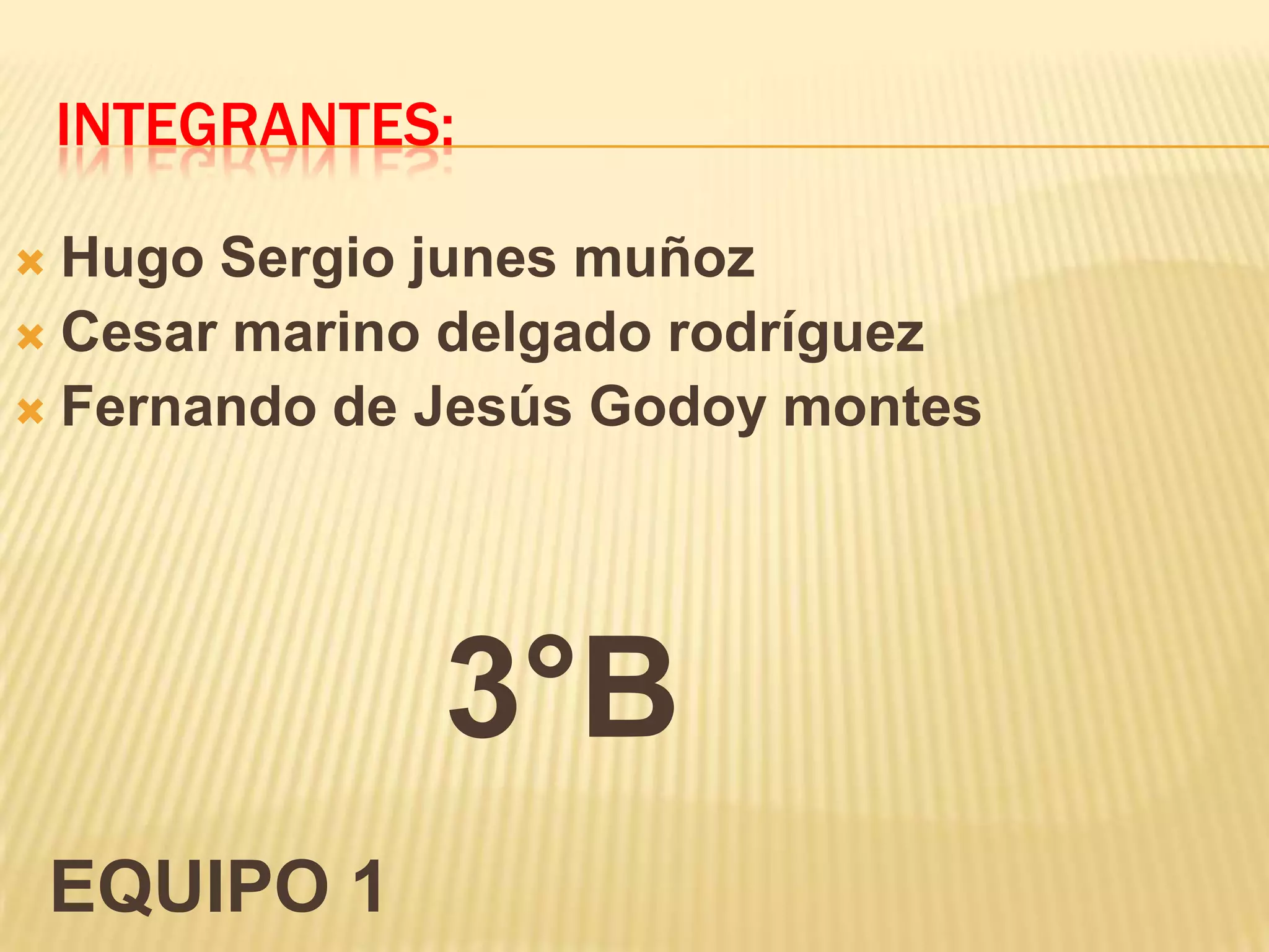 El documento lista los nombres de tres integrantes del Equipo 1 y su grupo de clase 3°B. Hugo Sergio Junes Muñoz, Cesar Marino Delgado Rodríguez y Fernando de Jesús Godoy Montes son los tres miembros del Equipo 1 mencionados en el documento.