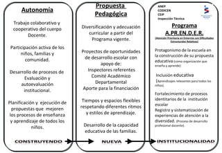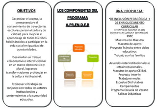 El documento propone una estrategia educativa que promueve el trabajo colaborativo entre docentes, familias y la comunidad. Busca asegurar que todos los niños tengan acceso a una educación de calidad a través de una propuesta pedagógica diversificada y adaptada a sus necesidades individuales. También apunta a desarrollar procesos de evaluación y autoevaluación institucional para mejorar continuamente los procesos de enseñanza y aprendizaje.