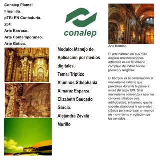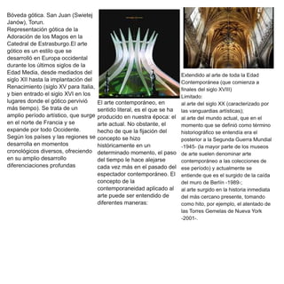 El documento presenta información sobre tres estilos artísticos: el Barroco, el Gótico y el Arte Contemporáneo. Explica que el Barroco surgió como continuación del Manierismo italiano en el siglo XVI y se caracterizó por expresar un mundo en movimiento y agitación de los sentidos. También describe que el arte Gótico se desarrolló en Europa occidental entre los siglos XII y XV, expandiéndose desde el norte de Francia. Finalmente, define el Arte Contemporáneo como el producido en la época actual, aunque