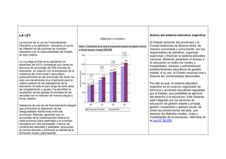 La Ley de Financiamiento Educativo cumplió con sus objetivos de aumentar la inversión en educación como porcentaje del PIB, ampliar la cobertura educativa en niveles iniciales y secundarios, y mejorar los salarios docentes en todo el país. El sistema educativo argentino es responsabilidad conjunta del Estado nacional y las provincias, y comprende servicios de gestión estatal, privada, cooperativa y social en todos los niveles educativos definidos por la ley. La ley buscó promover la equidad entre provincias y priorizar