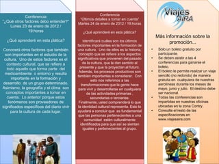 Este documento describe una serie de cuatro conferencias sobre el concepto de cultura. Asiste a las conferencias para ganar un boleto de avión gratis. La primera conferencia explora los diferentes significados del término "cultura". La segunda examina la cultura como un concepto antropológico. La tercera cubre la cultura como un concepto estético. La cuarta identifica otros factores importantes como la historia y los procesos productivos en el estudio de la cultura.