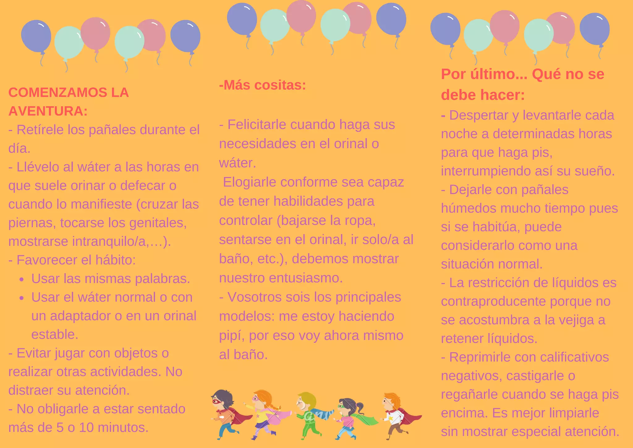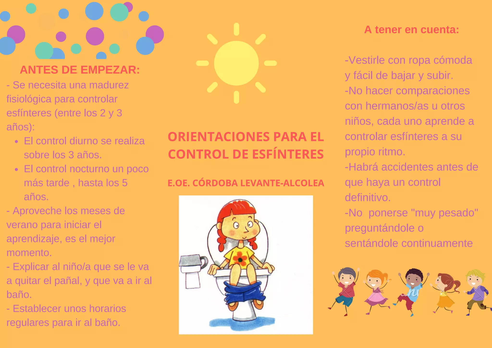 Este documento proporciona orientaciones para el control de esfínteres en niños entre 2 y 5 años. Señala que cada niño aprende a su propio ritmo y que habrá accidentes antes del control definitivo. Recomienda vestirles con ropa cómoda, establecer horarios para ir al baño y elogiarles cuando lo hagan bien sin regañarles si tienen accidentes.
