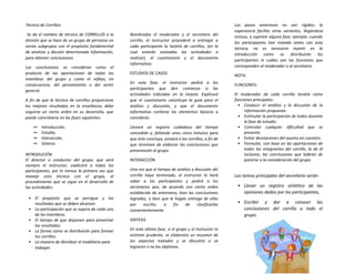 La tarjeta de corrillos es un documento que proporciona información sobre las actividades, propósitos y materiales que se utilizarán en una sesión de corrillos. La técnica de corrillos implica dividir a un grupo en subgrupos para analizar y discutir información y llegar a conclusiones. El proceso incluye las fases de introducción, estudio, interacción y síntesis, y tiene roles definidos como el moderador y secretario para cada corrillo.