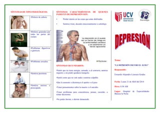 La depresión es un trastorno que afecta el cerebro, el estado de ánimo y el pensamiento, alterando la forma en que la persona come, duerme, piensa y se siente acerca de sí misma. Los síntomas de la depresión incluyen sentimientos de tristeza, falta de energía, cambios en el apetito o sueño, pensamientos sobre la muerte y dificultad para concentrarse. Existen diferentes tipos de depresión como la depresión severa, la distimia y el trastorno bipolar, y las causas pueden incluir fact