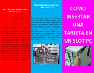 El documento describe los pasos para instalar una tarjeta gráfica en una PC: 1) Retirar la chapa del zócalo en la parte trasera de la caja, 2) Colocar la tarjeta verticalmente en el zócalo y presionar hasta que quede firme, 3) Asegurar la tarjeta al chasis con un tornillo y cerrar el clip de seguridad. Adicionalmente, se debe instalar el driver de la tarjeta y configurar las propiedades gráficas.