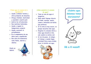 El documento ofrece recomendaciones para cuidar el agua, incluyendo cerrar la llave mientras se lava los dientes o manos, tomar baños cortos, lavar la ropa en cargas completas y reparar fugas. También sugiere juntar el agua fría de la ducha para regar plantas y celebrar el Día Mundial del Agua.