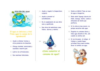 El documento ofrece recomendaciones para cuidar el agua del planeta cerrando la llave mientras nos lavamos las manos o los dientes, tomando baños cortos, lavando la ropa en cargas completas y reparando fugas. También promueve celebrar el Día Mundial del Agua y los beneficios de beber agua para la salud, como ayudar a eliminar toxinas y mantenernos hidratados, además de sugerir formas de aumentar el consumo como agregar sabores y llevar agua cuando salgamos.