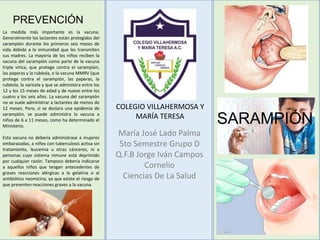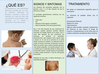 El sarampión es una enfermedad infecciosa causada por un virus que se disemina fácilmente de persona a persona y causa una erupción en la piel de color roja con manchas que suele comenzar en la cabeza y descender al resto del cuerpo. Los síntomas incluyen fiebre alta, tos, moqueo, ojos enrojecidos y llorosos, y una erupción cutánea que comienza en la cara. No existe un tratamiento específico, pero los síntomas se pueden aliviar con paracetamol, reposo y