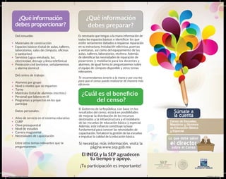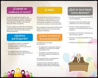 El documento proporciona información sobre un censo escolar que se llevará a cabo en México. Se solicita a los directores escolares que provean datos sobre las instalaciones, personal, programas, y necesidades de cada escuela para que el gobierno pueda distribuir mejor los recursos y mejorar la calidad de la educación. El censo se realizará en septiembre de 2013 a cargo del INEGI y la SEP para obtener información actualizada sobre las escuelas, maestros y estudiantes.