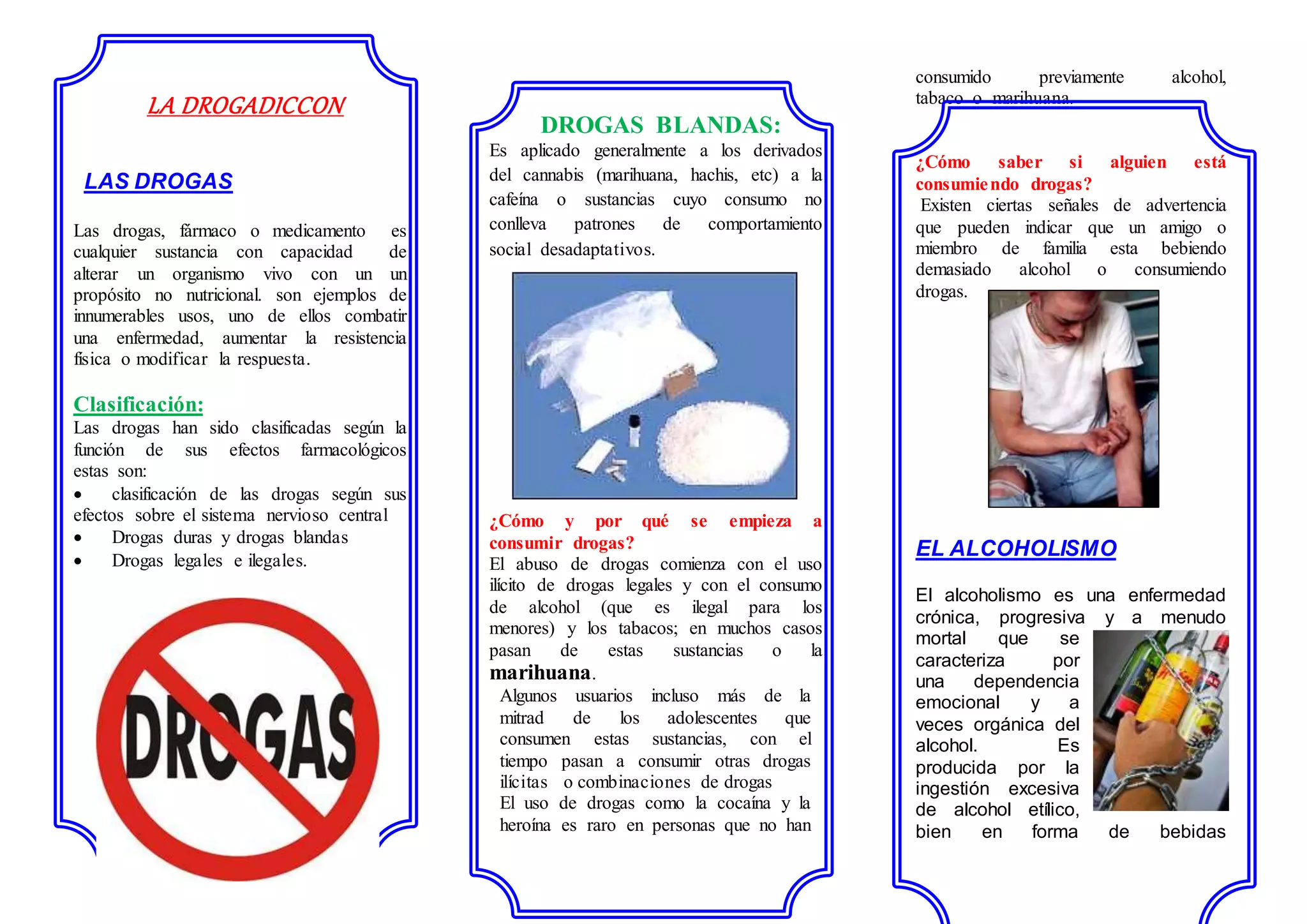 Este documento trata sobre las drogas y el alcoholismo. Explica que las drogas son sustancias que alteran los organismos vivos con propósitos no nutricionales y se clasifican según sus efectos en el sistema nervioso central. También describe las drogas blandas como la marihuana y las señales de advertencia del consumo de drogas. Finalmente, define el alcoholismo como una enfermedad crónica caracterizada por la dependencia emocional y física del alcohol y explica algunos de sus efectos.
