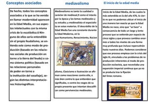 El documento define la Edad Media como el período entre los siglos V y XV, marcado por la caída del Imperio Romano y el descubrimiento de América. Surgen nuevas formas políticas como el califato islámico y los poderes de la cristiandad, así como ciudades-estado. La Edad Media vio la transición desde la economía esclavista al feudalismo y cambios sociales, políticos e ideológicos. Aunque suele fecharse su inicio en 476, realmente fue un proceso lento que com