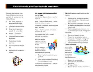 El documento describe las variables clave de la planificación de la enseñanza. Estas variables incluyen 1) las metas y objetivos, 2) la selección de contenidos, 3) la organización y secuenciación de contenidos, 4) las tareas y actividades, 5) la selección de materiales y recursos, 6) la participación de los alumnos, 7) la organización del escenario, y 8) la evaluación de los aprendizajes. El documento proporciona detalles sobre cada una de estas variables y los factores que se deben considerar al abordar