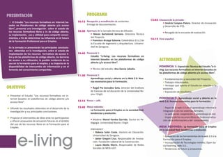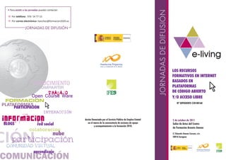 Este documento describe una jornada de difusión sobre los recursos formativos en Internet basados en plataformas de código abierto y acceso libre. La jornada incluirá la presentación de un estudio sobre este tema, dos ponencias sobre aprendizaje abierto en la Web 2.0 y una mesa redonda sobre las tendencias de la formación para el empleo en la sociedad en red. Los interesados pueden contactar por teléfono o correo electrónico para asistir.