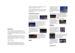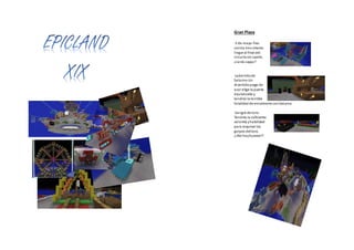 El documento presenta el programa de actividades y atracciones de un parque temático llamado Epicland XIX, dividido en diferentes zonas temáticas como Gran Plaza, El cementerio romántico, Isabel II, Lobotomía y El agujero negro. Incluye espectáculos como toros, batallas y fuegos artificiales, así como atracciones acuáticas, montañas rusas y casas embrujadas basadas en la historia y personajes del siglo XIX. El parque busca entretener e instruir a los visitantes sobre la época a