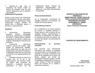El documento describe las diferentes fuentes y tipos de financiamiento para empresas e individuos. Explica que el financiamiento son los recursos monetarios para llevar a cabo actividades económicas, generalmente préstamos que complementan los recursos propios. Luego detalla los tipos de financiamiento a corto y largo plazo disponibles, como pagarés, líneas de crédito, acciones y bonos. Finalmente, clasifica las instituciones financieras privadas, públicas y entidades que otorgan créditos.