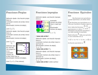 Las fracciones son expresiones matemáticas que representan la división de una cantidad en partes iguales. Una fracción muestra cuántas partes se están considerando de la cantidad total dividiéndola en un número determinado de partes iguales. Existen fracciones propias, donde el numerador es menor que el denominador, e improprias, donde el numerador es mayor o igual que el denominador.
