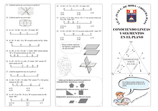 Este documento trata sobre líneas y puntos en el plano. Explica conceptos como rayos, semirrectas y segmentos de recta. También aborda conjuntos convexos y cómo una recta o punto separan el plano en diferentes conjuntos. Finalmente, presenta algunos ejercicios sobre puntos de corte entre líneas y figuras geométricas.