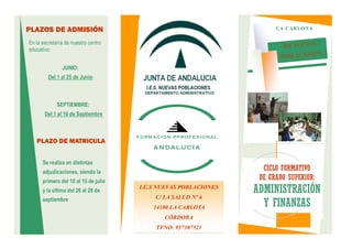 Este documento proporciona información sobre los plazos de admisión y la formación profesional del Ciclo Formativo de Grado Superior en Administración y Finanzas en el IES Nuevas Poblaciones en La Carlota, Córdoba. El ciclo dura 2 años con 2000 horas de formación que cubren módulos profesionales como gestión financiera, contabilidad, recursos humanos y proyecto empresarial. Para acceder al ciclo se requiere el título de bachillerato o una prueba para mayores de 19 años. El c