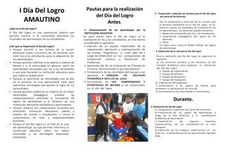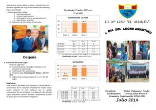 El documento describe las pautas y la importancia del Día del Logro, una celebración para mostrar los resultados de aprendizaje de los estudiantes. Explica que permite a la comunidad educativa evaluar los procesos de aprendizaje y compartir metas y estrategias de mejora. Además, ofrece un resumen del desempeño de los estudiantes en las pruebas ECE de los últimos años que muestra un crecimiento en comprensión lectora y matemática.