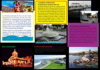 La provincia de Ilo en Perú cuenta con hermosas playas para bañarse y practicar deportes acuáticos, así como temperaturas cálidas. Ilo también fue el hogar de la cultura pre-inca Chiribaya, que floreció entre los años 800 y 1350 d.C. a lo largo del valle del río Ilo, aprovechando los recursos marinos y convirtiendo el desierto en tierras fértiles. Las principales atracciones turísticas de Ilo incluyen la Plaza de Armas, la Glorieta José Gálvez y el Mal