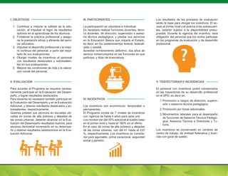 El documento describe el Programa de Promoción en la Función por Incentivos en Educación Básica implementado por la SEP. El programa sustituye al anterior Programa de Carrera Magisterial y se implementará gradualmente de 2015 a 2018. Los maestros que participen voluntariamente serán evaluados y aquellos con resultados destacados recibirán incentivos económicos adicionales a su sueldo de hasta el 180%. El personal con Carrera Magisterial conservará los beneficios adquiridos y podrá participar también en el nuevo programa.