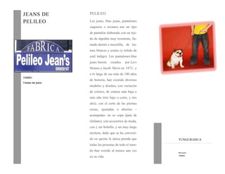 El documento describe una fiesta del jean en Pelileo-Tambo, donde habrá promociones y diversos diseños de jeans para hombres y mujeres. Los pantalones tubo son una pieza popular esta temporada y vienen en múltiples estilos, texturas y colores. El evento invita a los visitantes a ver los jeans de Pelileo.