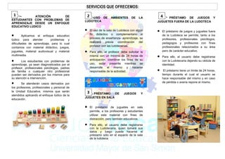 La ludoteca escolar tiene como misión contribuir al desarrollo integral de los estudiantes a través del uso del juego, el juguete y el libro para complementar los procesos de enseñanza y aprendizaje. Su visión es ser una referencia en el uso del enfoque lúdico de la educación para promover el desarrollo de los estudiantes mediante el juego, la lectura y actividades grupales. El objetivo general es brindar un espacio de participación lúdica que estimule la creatividad, mientras que los objetivos específicos incl