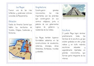 Los Mayas destacaron en la cerámica, especialmente en la pintura mural y suntuaria con diseños geométricos y escenas narrativas. Representaban dioses, animales fantásticos y seres sobrenaturales. La cerámica tenía usos prácticos y rituales, y estaba decorada con figurillas de dioses expresando conceptos mágicos. Los Mayas construyeron grandes monumentos como pirámides, palacios y obras hidráulicas, y dominaron técnicas de escultura como bajorrelieves y esculturas