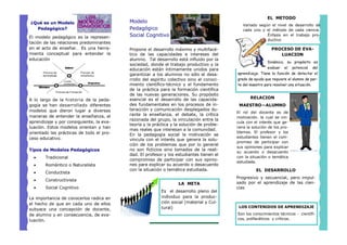 Este documento describe el modelo pedagógico social cognitivo. Este modelo propone el desarrollo máximo de las capacidades del alumno a través de experiencias que están influenciadas por la sociedad y donde la educación y el trabajo productivo están íntimamente unidos. El rol del docente es motivar a los alumnos a resolver problemas reales de la comunidad y fomentar el debate y la crítica razonada.