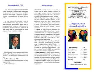Este documento presenta los conceptos fundamentales de la Programación Neurolingüística (PNL). Explica que la PNL se refiere a la conexión entre los procesos neurológicos, el lenguaje y los patrones de comportamiento aprendidos. Describe los tres niveles de estrategias en PNL y los seis niveles lógicos de la programación mental. También resume los principales canales de percepción y algunas técnicas básicas de la PNL como el rapport y el uso de anclas.