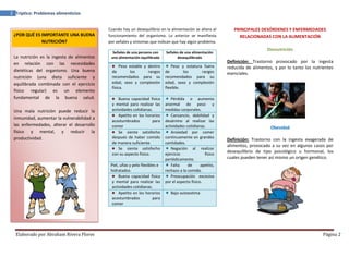 El documento trata sobre los problemas alimenticios. Describe dos trastornos alimenticios principales: la bulimia, caracterizada por episodios repetidos de ingesta excesiva seguidos de provocación de vómito, y la anorexia nerviosa, definida por el miedo intenso a ganar peso y una imagen distorsionada del propio cuerpo. También explica que una mala nutrición puede reducir la inmunidad y aumentar la vulnerabilidad a enfermedades.