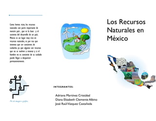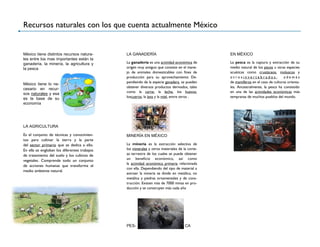 México tiene abundantes recursos naturales como la ganadería, la minería, la agricultura y la pesca, los cuales son fundamentales para su economía. Estos recursos incluyen minerales, tierras de cultivo, ganado y vida acuática. Sin embargo, algunos recursos como los minerales no se renuevan y su sobreexplotación podría hacerlos desaparecer permanentemente, por lo que es importante que los mexicanos cuiden sus recursos naturales para el desarrollo sostenible del país.
