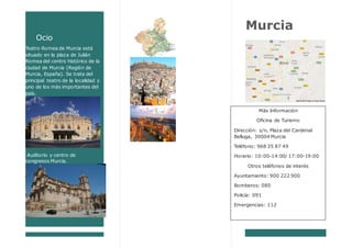 El Teatro Romea de Murcia se encuentra en la plaza Julián Romea en el centro histórico de la ciudad de Murcia. Es el principal teatro de la localidad y uno de los más importantes de España. Murcia es la capital de la Región de Murcia y está situada a orillas del río Segura, con una población de 441.003 habitantes. Algunos de los principales puntos de interés de la ciudad incluyen la Catedral de Santa María, el Palacio Episcopal, la Plaza de Santo Domingo y el Teatro Romea.