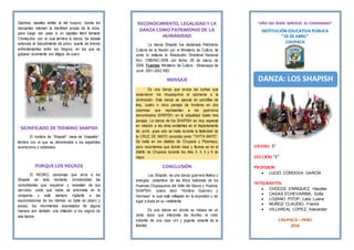 Este documento describe la danza guerrera de los Shapish de Chupaca, Perú. Los Shapish representan a guerreros que se oponían a la dominación española. La danza consiste en tres partes y representa una batalla entre dos grupos de guerreros. Se baila principalmente durante las celebraciones de la Cruz de Mayo en Chupaca.