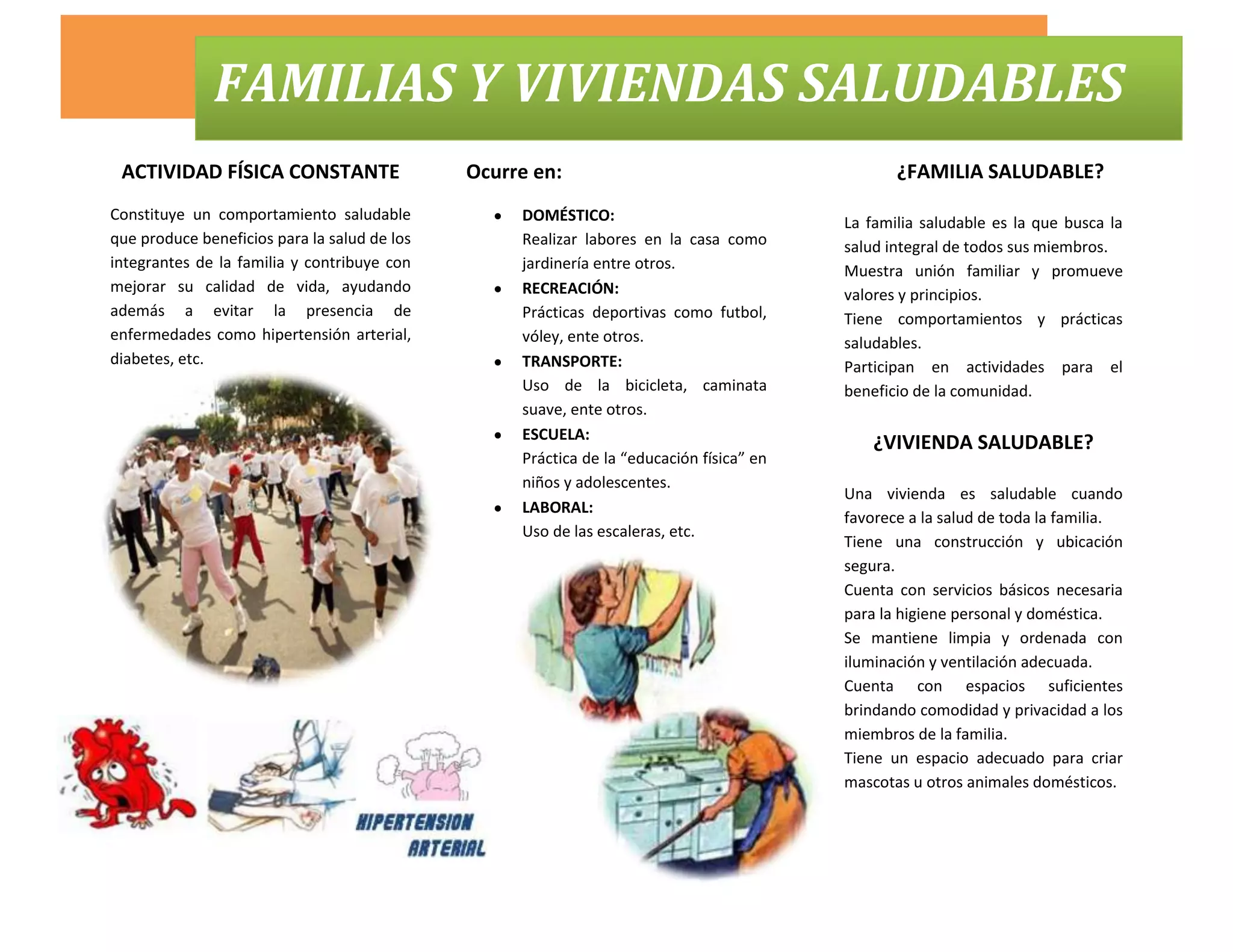 Una familia y vivienda saludables se caracterizan por tres aspectos: 1) Promover la actividad física constante de sus miembros a través de actividades domésticas, recreativas, de transporte o laborales. 2) Tener una vivienda que cuente con servicios básicos, construcción y ubicación segura, y espacios suficientes que brinden comodidad. 3) Fortalecer prácticas de higiene personal, del agua, de los alimentos y del ambiente para prevenir enfermedades.