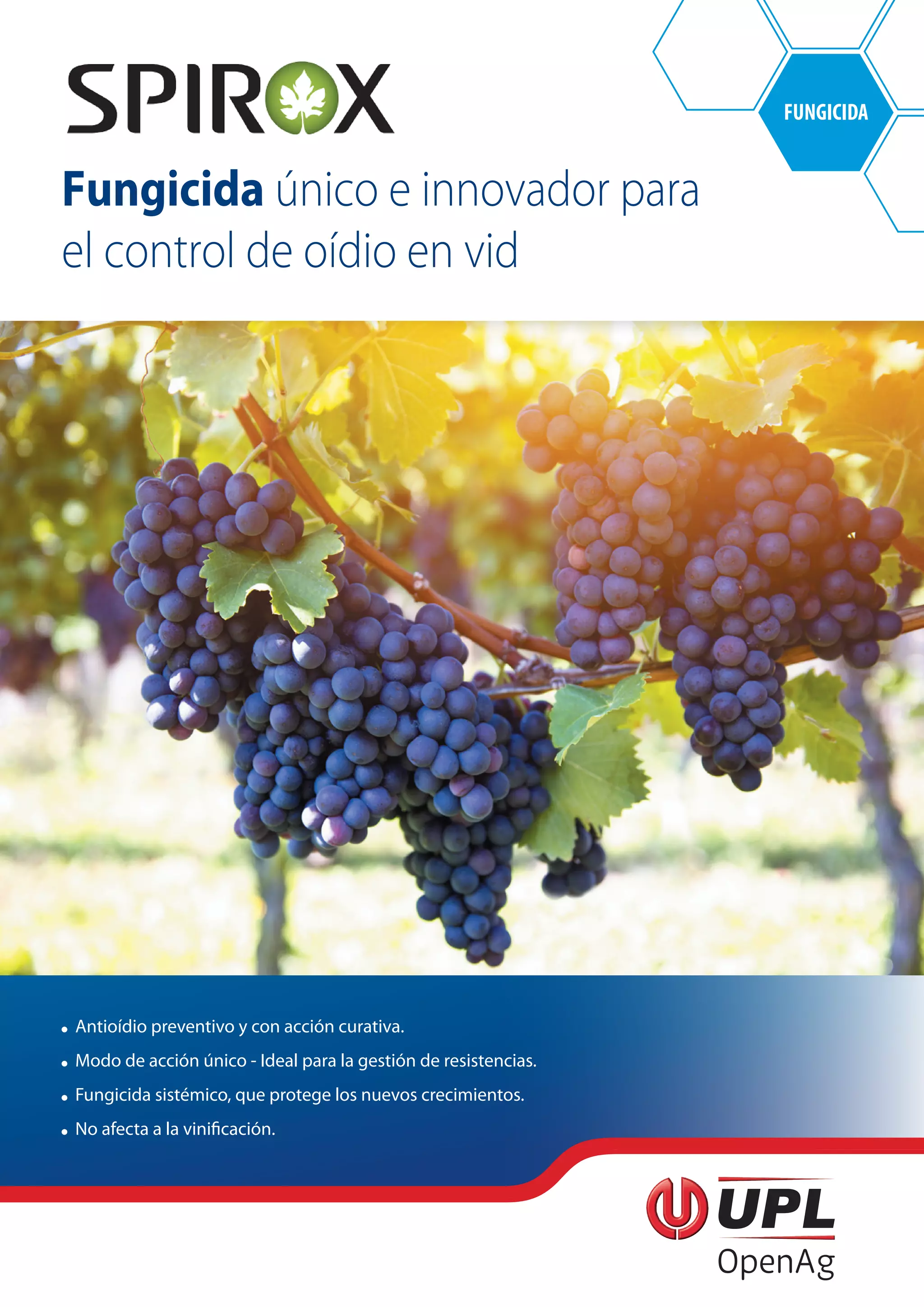 Este documento describe las propiedades y el modo de acción único del fungicida Spirox 500 EC para el control de oídio en la vid. Spirox 500 EC contiene la sustancia activa Espiroxamina, la cual inhibe enzimáticamente la biosíntesis del ergosterol fúngico en 4 puntos diferentes. Esto proporciona una acción preventiva y curativa contra el oídio, protegiendo los nuevos crecimientos de la vid. Los ensayos muestran una alta eficacia en el control de oídio sin afect