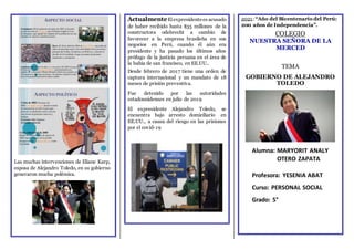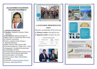 Alejandro Toledo fue el presidente constitucional del Perú desde 2001 hasta 2006. Nació en 1946 en Ancash y se desempeñó como economista. Actualmente está acusado de recibir $35 millones de Odebrecht a cambio de favorecer a la empresa cuando era presidente. Desde 2017 tiene una orden de captura internacional y arresto domiciliario en EE.UU. debido al riesgo de COVID-19 en prisión.