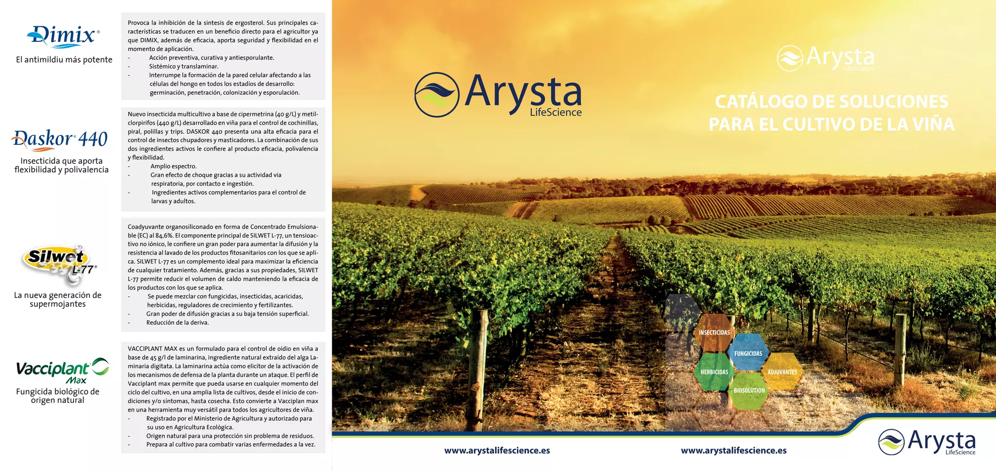 El documento presenta varios productos fitosanitarios para el cultivo de la vid, incluyendo fungicidas, insecticidas y coadyuvantes. Describe brevemente cada producto, mencionando sus ingredientes activos, plagas objetivo, dosis y otros detalles clave. El catálogo incluye opciones para el control de enfermedades como el mildiu, oidio y botritis, así como plagas de insectos, además de productos biológicos y coadyuvantes para mejorar la eficacia de los tratamientos.