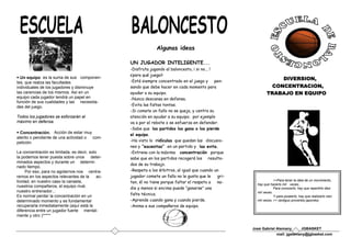 Este documento ofrece consejos para ser un jugador inteligente de baloncesto. Un jugador inteligente disfruta jugando, se mantiene concentrado para ayudar a su equipo, evita faltas tontas, no se queja de errores, y anima a sus compañeros. También respeta a los árbitros y aprende tanto de las victorias como de las derrotas.