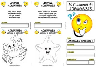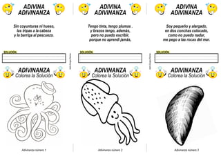 Este documento contiene 5 adivinanzas sobre animales marinos. Cada adivinanza presenta una breve descripción física o de comportamiento del animal en forma de acertijo, sin revelar su identidad. El lector debe intentar adivinar de qué animal se trata en cada caso.