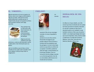 El documento habla sobre la lectura y recomienda varios libros de fantasía. Explica que aunque a algunas personas no les gusta leer, existen libros para todos los gustos que pueden descubrir qué tipo de lectura les interesa. Luego reseña brevemente cinco libros de fantasía recomendados, incluyendo FirElight de Sarah J. Maas, que trata sobre una chica dragón; gEnEalogía dE una bruja, un álbum sobre una niña que descubre su legado como bruja; y La sombra del viento