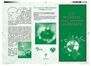 El documento habla sobre la responsabilidad individual en la protección del medio ambiente. Explica que muchos problemas ambientales se originan en nuestros hábitos de producción y consumo, y que pequeños cambios en casa como reducir, reutilizar y reciclar pueden marcar una gran diferencia. También ofrece consejos prácticos para ahorrar energía, agua y reducir la contaminación a través de la iluminación eficiente, el uso eficiente de electrodomésticos, cierre de grifos y duchas cortas.