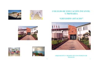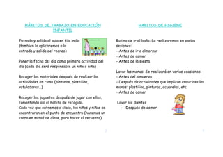 Este documento describe los hábitos de trabajo y de higiene que se enseñarán en el Colegio de Educación Infantil y Primaria "Gregorio Artacho". Se enfatiza la importancia de entrar y salir del aula en fila india, poner la fecha del día como primera actividad, y recoger materiales después de usarlos para fomentar buenos hábitos de trabajo. También se detallan rutinas para ir al baño, lavarse las manos, y lavarse los dientes con el fin de promover la higiene.