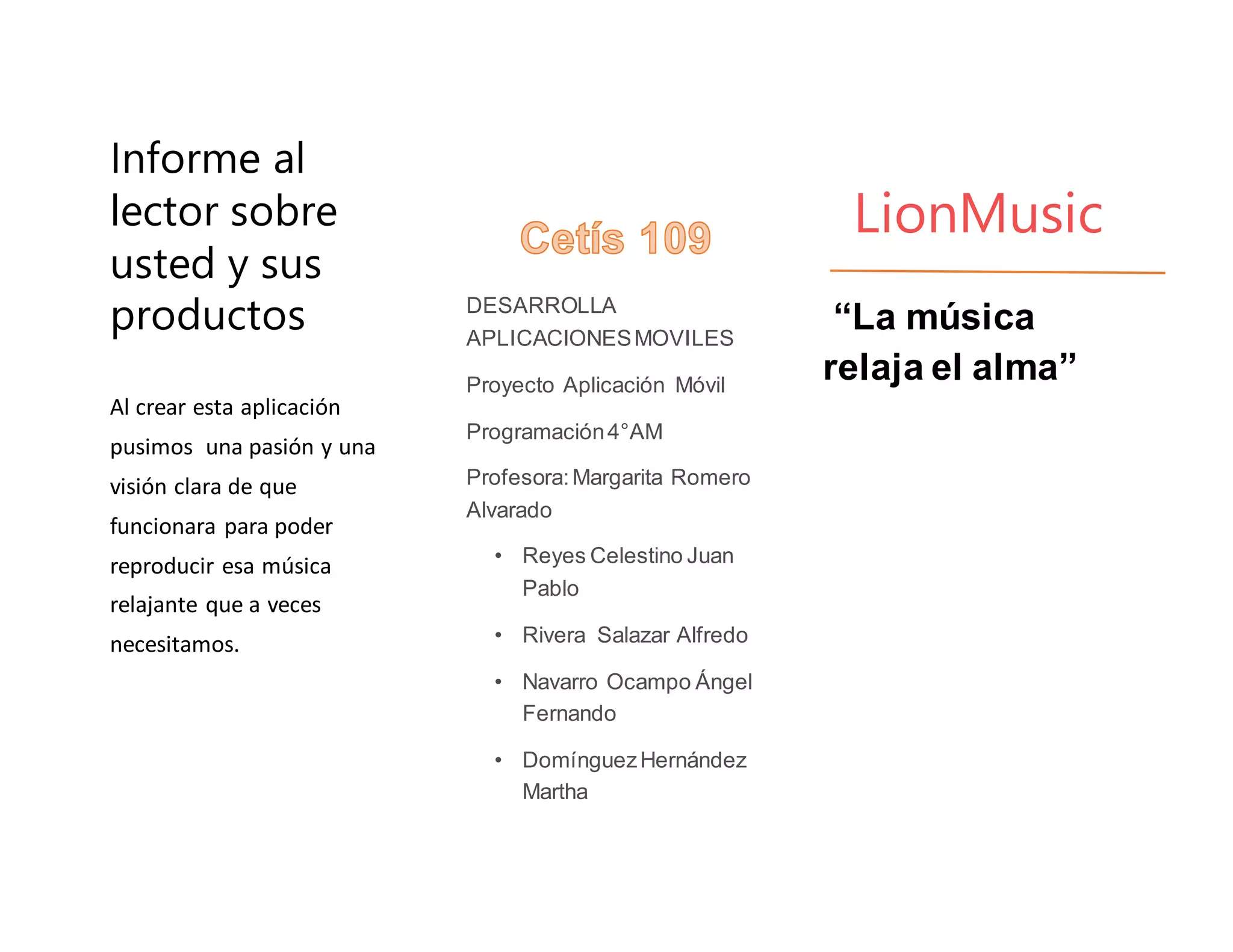 El documento presenta un proyecto de una aplicación móvil llamada LionMusic creada para reproducir música relajante. La aplicación fue desarrollada usando Eclipse y tiene como objetivo principal proveer música relajante para los días estresantes. La aplicación está dirigida a usuarios que buscan momentos de descanso y relajación a través de la música.